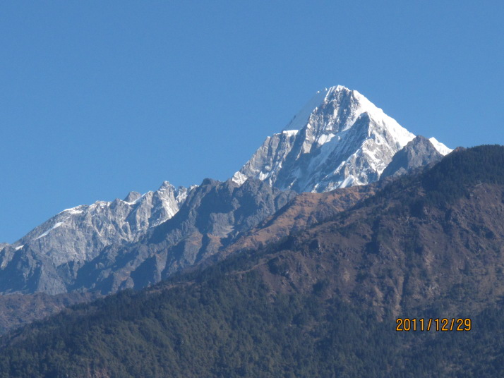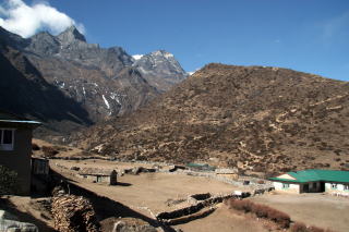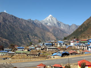 学校の目の前のロッジで昼飯を摂りに入るとここでも店の主人が衛星テレビを見ていた。スパゲッテイとジャガイモを食べて店を出る。村の裏手(東側)には聖なる山、クーンビラ(5761m)が聳え何人も登ってはいけない山だと言う。