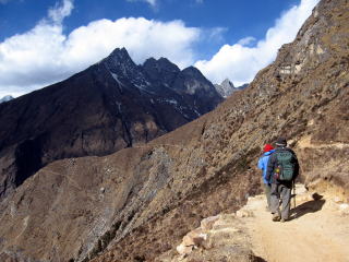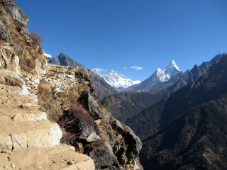 この日は下りでパンボチェ3901mから3260mのポルツエタンガまで急斜面の岩場ルートでエベレストに背を向けて歩くコース賑やかなエベレスト街道からは北ルートになる。コンデ・リ、クーンビラを目の前にしながら行き交う人はほとんどいないので埃の心配も余り無いので快適だ。4時間の間に2組だけ会うが静かでとても気分が爽快だ。ポルツェでバッテイに入り少し早いがフライドヌードルで昼飯を食べた。