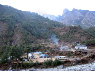 今日はシェルパのナンブールと二人で8時半に出かける。カメラ類の荷物はすべて彼が持ち空身の自分がなんとも申し訳ないようである。テシンガでポーターが一人高山病で担がれてきたがどうやら間に合わず息を引き取ったという。仲間が傍らで検視がくるまで待つらしいが高所で働くポーターでも高所順応は欠かせないものであると聞かされた。クムジュン村手前でダフィー(日本で言う雉)が雄雌ツガイで畑の隅に出てきたがカメラが間に合わず写真は撮れなかった。この村には諸外国からの支援で建てられたという高校があり周辺の村から子供たちが通い校庭でも熱心に勉強している光景を見学した。村全体が屋根の塗装がほとんど同系色(青色)で塗られ、まるでヨーロッパの赤屋根を思わせる。村には唯一1本だけ街灯が設置され最近のソーラー電池も進化したものだと感心した。