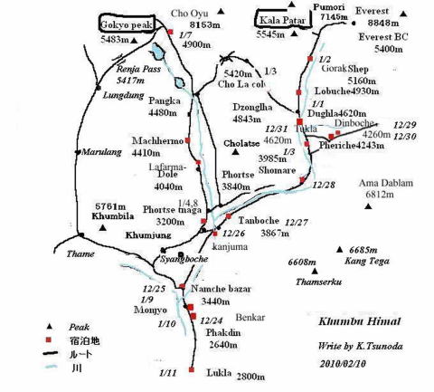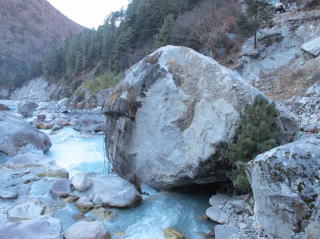 マッチエルモを出てパンカの手前で1月3日にパンボチェを同時に出発した南アフリカ人の単独行トレッカーが下山してきた。彼はすでに昨日ゴーキョに登り今日は帰ると言う。それにしても随分早いペースで我々の二倍で歩ったことになる、恐るべしやつ。パンカで小休止を取りここで9年前に大雪で大きな雪崩が起きて村ごと埋まり邦人を含め14人の犠牲者が出たことをシェルパから聞かされた。日本でもこのことはニュースで報じられたのを思い出したが雪崩が起きるような傾斜にも思えない場所である。急な岩場の階段状ルートを登りドゥード・コシ横に氷河の先端(モレーン)を横目に詰めるとLongpongo Pokhari(小さな湖)から一気に滝のように流れ落ちる。