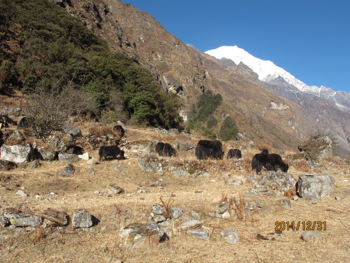 左から Langtang山群、 Langtang Lirung(7234m)、木材運搬のポーター、草を食むヤクとLangtang