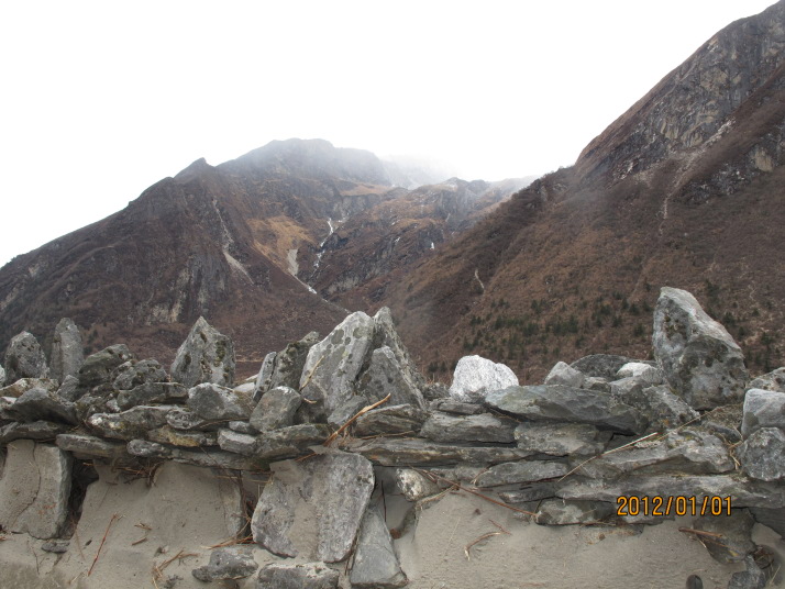 Langtang Kohlaの左岸を湿原を迂回しながら1時間のところでGanchenpo 方面のガスが切れ始めたのでしばらく撮影(0:10)
