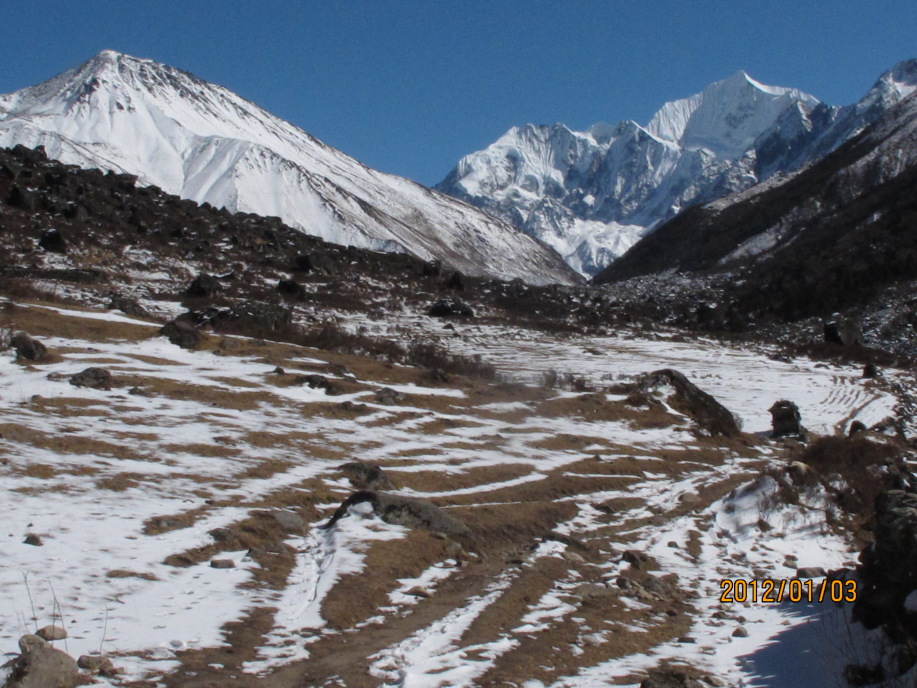 Karkaの横にZaiさんが三脚を立てる場所として雪を攪いてくれた。東にドルジェ6979m、ドルジェラクバ6966m、ガンチェンポ6387mが頂上に