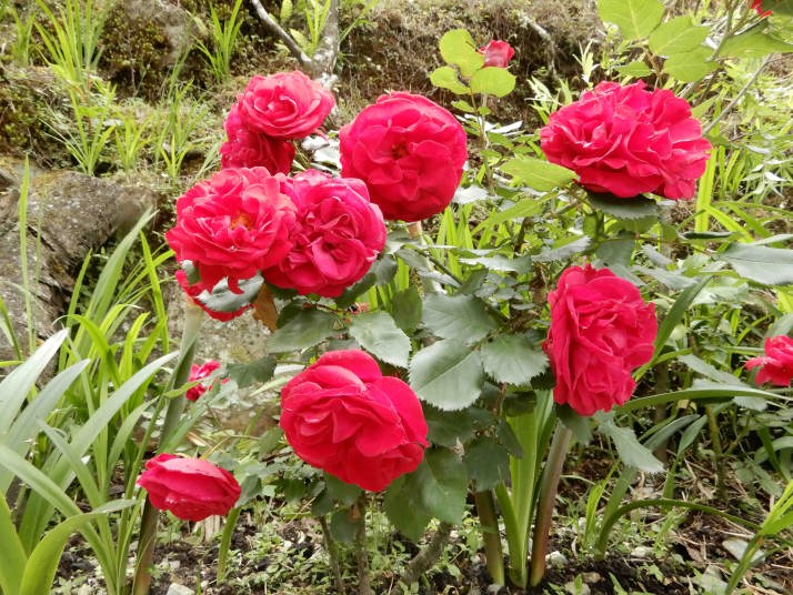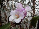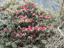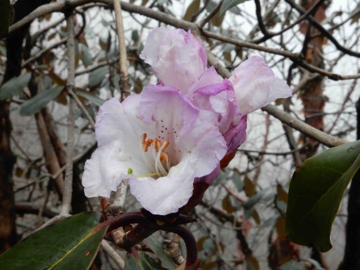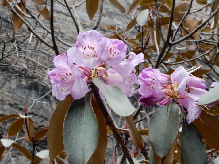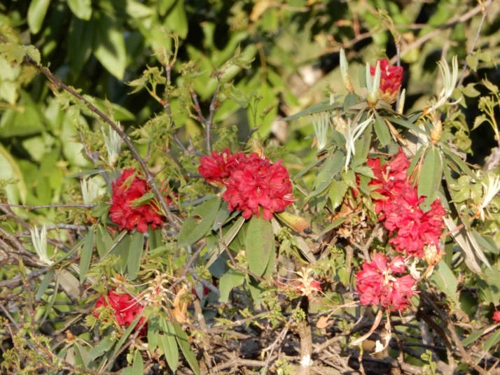 河原歩き途中シャクナゲ(赤い花)がところどころに咲いていてこの種類は遅咲きのようだ。しばらくして河原を過ぎると今度は急な登りと