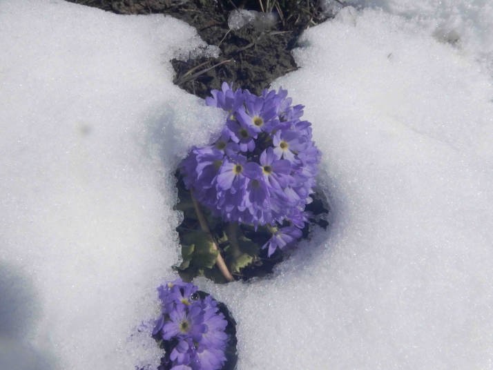 雪の中を歩く。溶けた草原の中から可憐な花がいたるところに撮影にいとまがなかった。