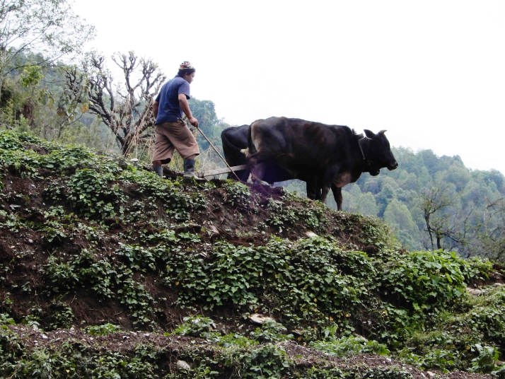 急がない。今日はビールとダルバートを注文して待つ。すぐ上の畑では珍しく牛に犂をつけ耕していたがこれから何を蒔くのかな。トウモロコシや