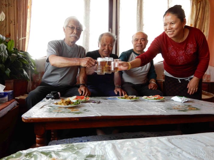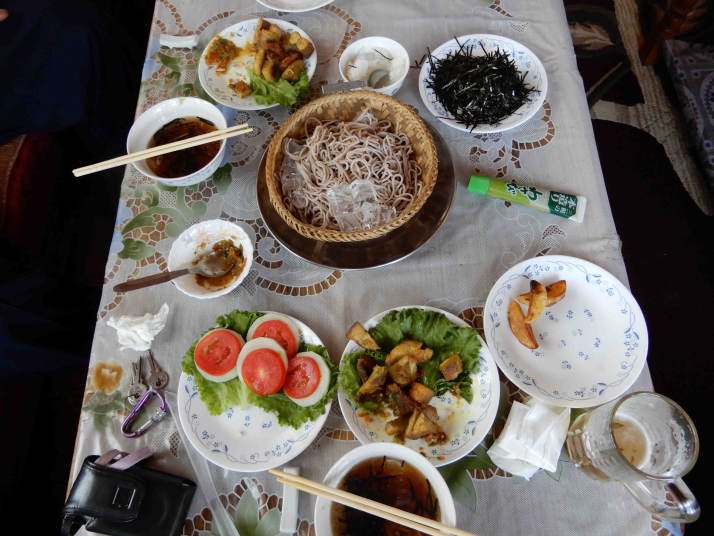 昼食 ざるそば、マヤさん手製のマトン肉、野菜、アルン、ビール、ロキシーなどで至福のひと時を過ごした。